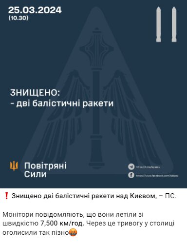 За даними Повітряних Сил, над Києвом було перехоплено та знищено дві балістичні ракети. Спостерігачі помітили, що ракети летіли зі швидкістю 7500 км/година.
