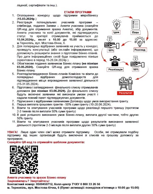 Цей мікрогрант, спрямований на розвиток підприємницької діяльності, доступний ВПО та сім'ям, які постраждали від повномасштабної війни, які проживають у Тернополі.