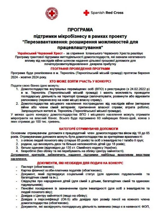 ПідписатисяТак, Тернопільське обласне відділення Українського товариства Червоного Хреста оголосило про фінансування відкриття, розширення чи активізацію підприємницької діяльності.