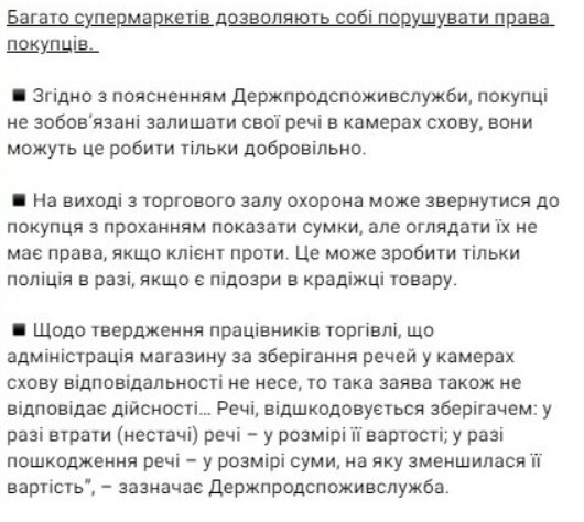 Також попри твердження працівників магазину, відповідальність за зберігання речей у камерах зберігання несе адміністрація магазину. Якщо предмети загублені або пошкоджені, зберігач несе відповідальність за компенсацію. Вона має бути надана залежно від вартості загубленого чи пошкодженого предмета.
