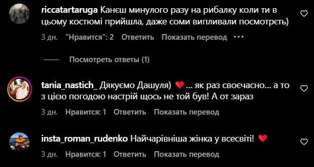 «Даша, джунглі є?», «Канєш минулого разу на рибалку коли ти в цьому костюмі прийшла, даже соми випливали посмотрєть)», «Дякуємо Дашуля) … як раз своєчасно… а то з цією погодою настрій щось не той був! А от зараз», «Найчарівніша жінка у всесвіті!», «Коли розлив варення на ноги і потім копнув ворону», - пишуть фолловери звірки.