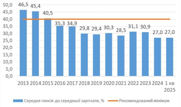 За останнє десятиліття в Україні цей показник різко впав, особливо після реформ попередньої адміністрації, яка зменшила коефіцієнт трудового стажу, який використовується для розрахунку пенсій, з 1,35% до 1% на рік.