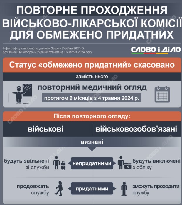 По новому закону у военнообязанных будет только два статуса: «годен» и «непригоден». Однако отмена статуса «ограниченной пригодности» не приводит автоматически к присвоению другого статуса лицам, ранее классифицированным как таковые. Вместо этого будет проведен повторный медицинский осмотр, по результатам которого будет принято решение об их годности.