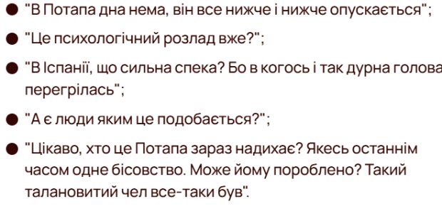 Многие выразили обеспокоенность творческими решениями Потапа, подвергнув сомнению его недавний творческий путь и размышляя об изменениях в его личных или профессиональных взглядах. Разделы комментариев под его постом были заполнены неоднозначными реакциями с заметным уклоном в сторону неодобрения.